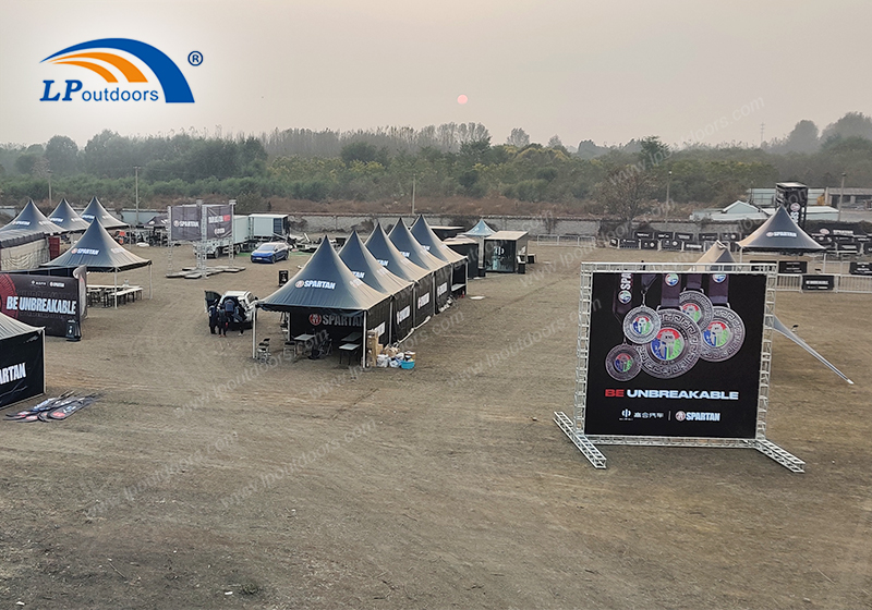 Las carpas pagoda (también conocidas como carpas de pico alto) se utilizan ampliamente en eventos deportivos a gran escala debido a su forma distintiva, estructura sólida y excelente potencial de marca. Para este proyecto Spartan Race, las tiendas de campaña tipo pagoda desempeñaron un papel central en todo el lugar del evento.